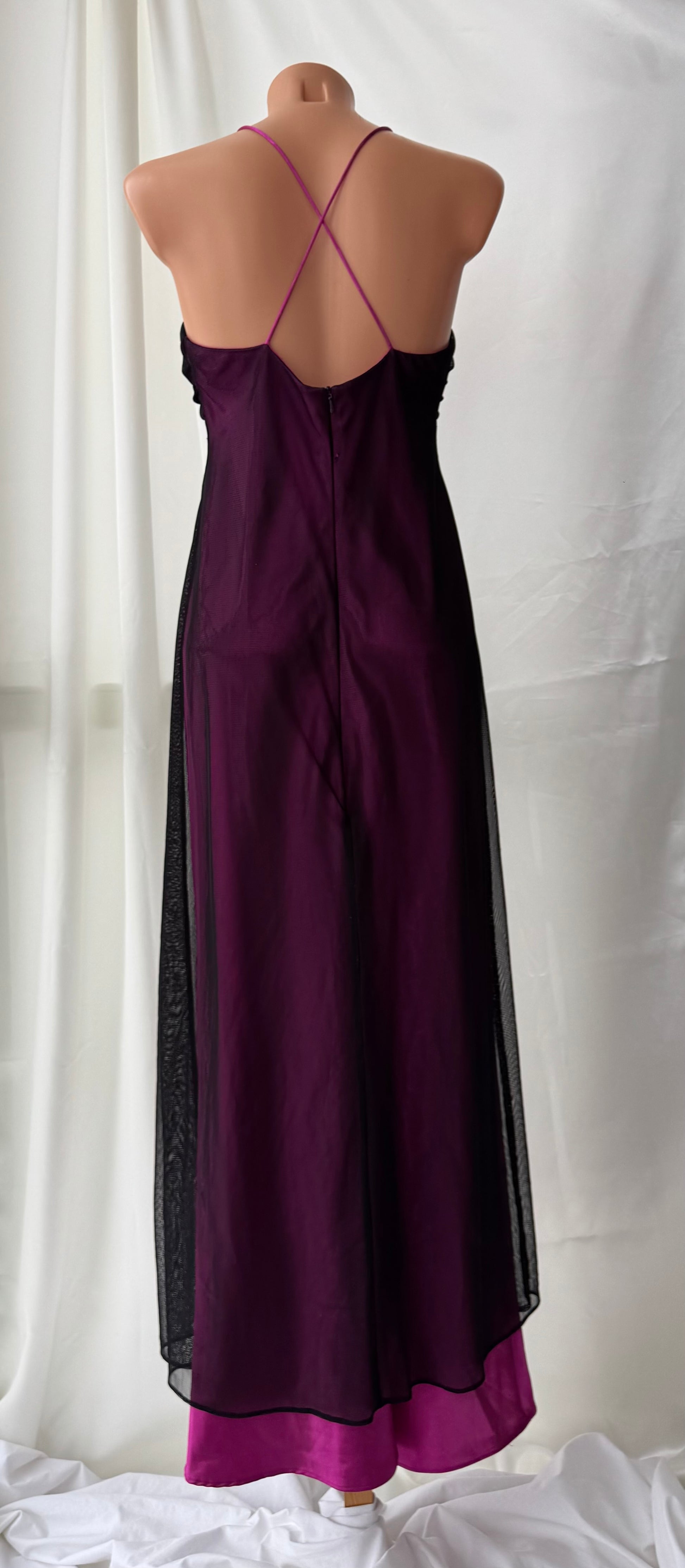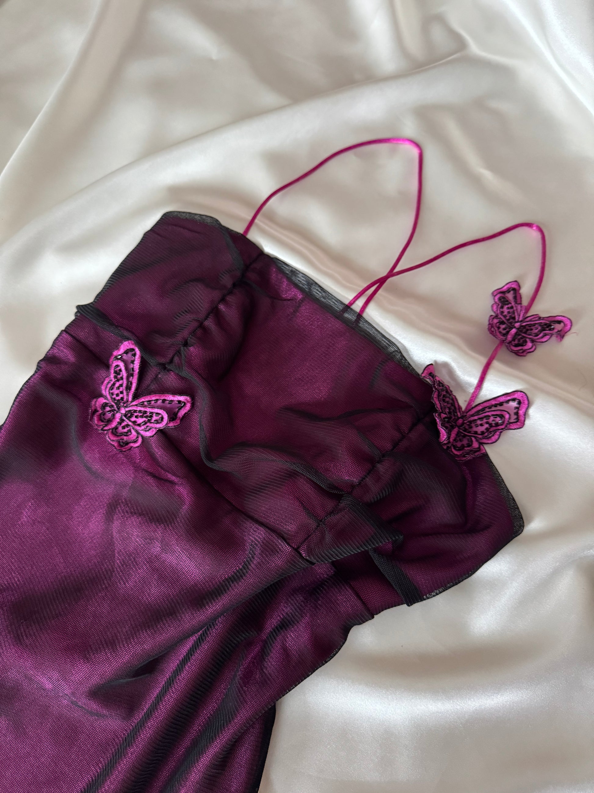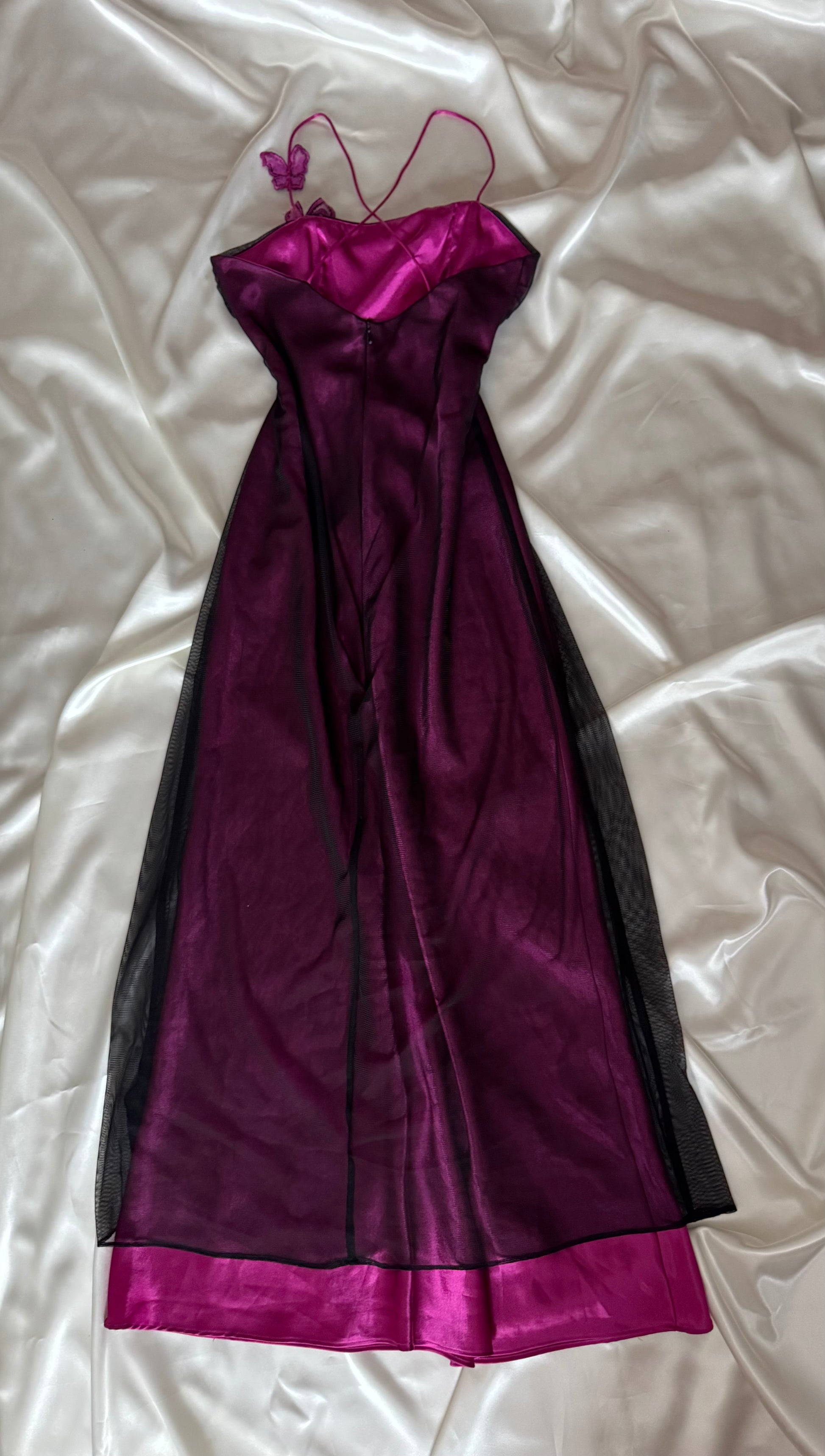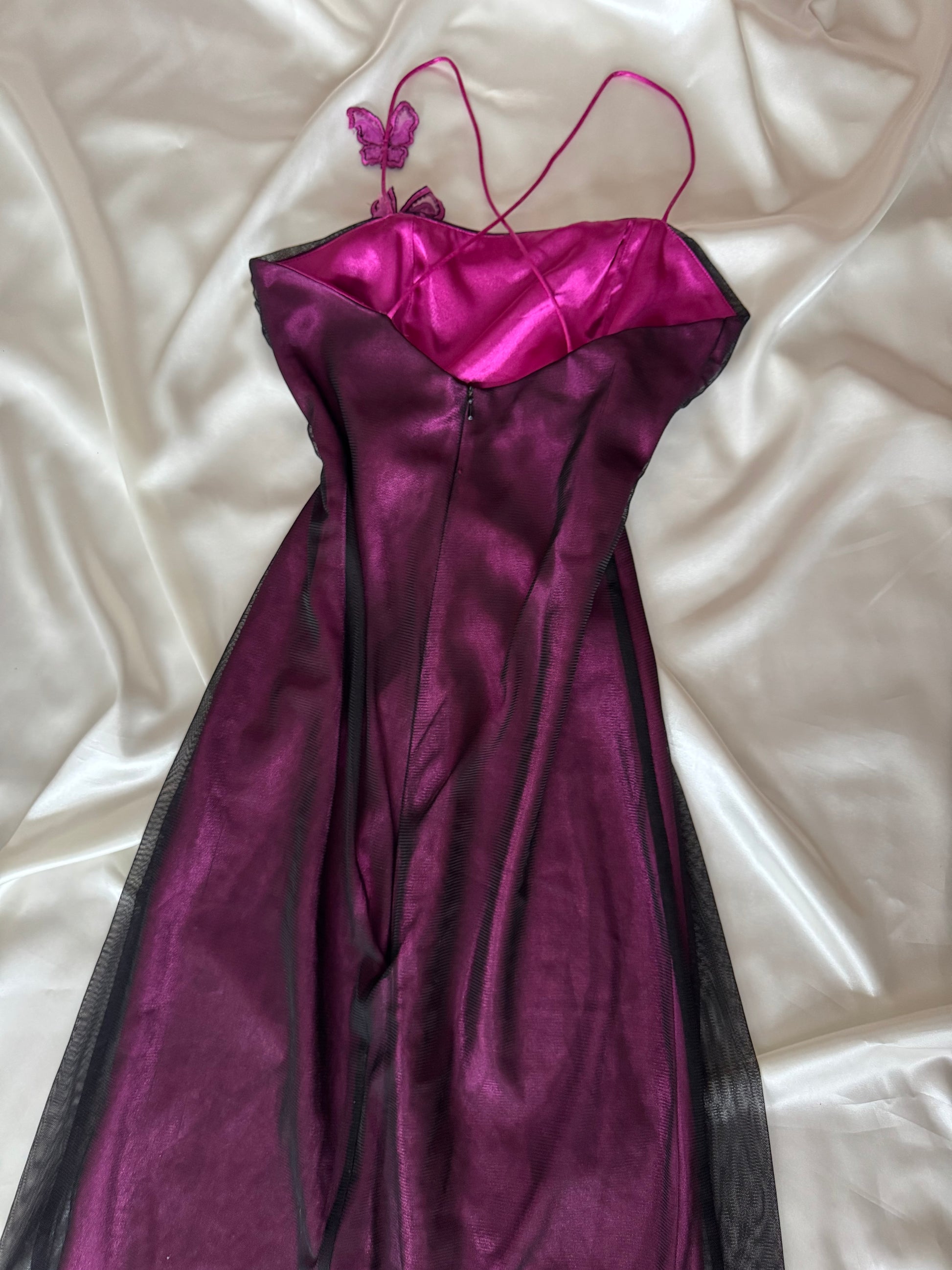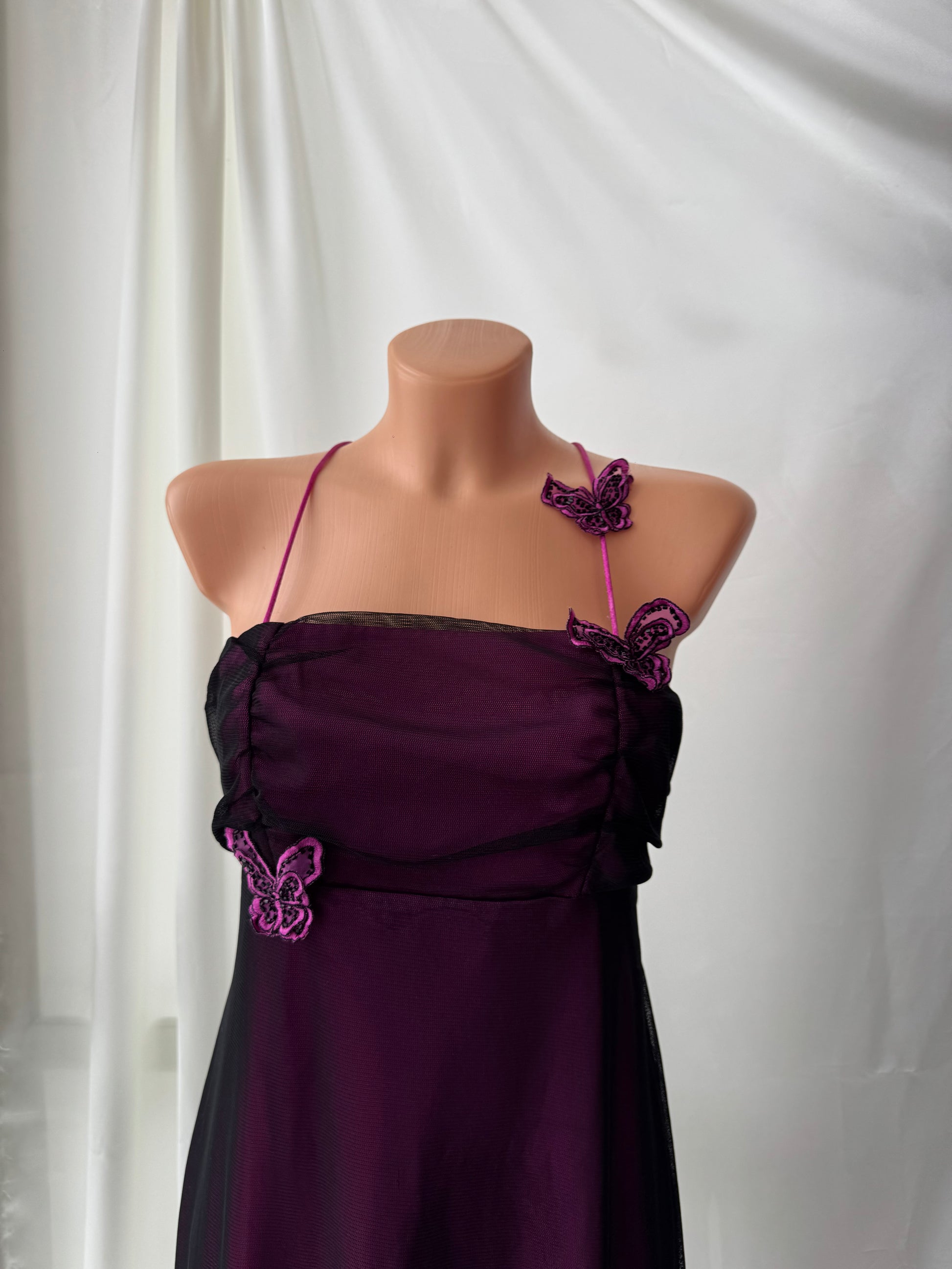 Beautiful long purple vintage gown in the royal period princess style with butterfly appliqués and black tuille overlay 💞 🦋