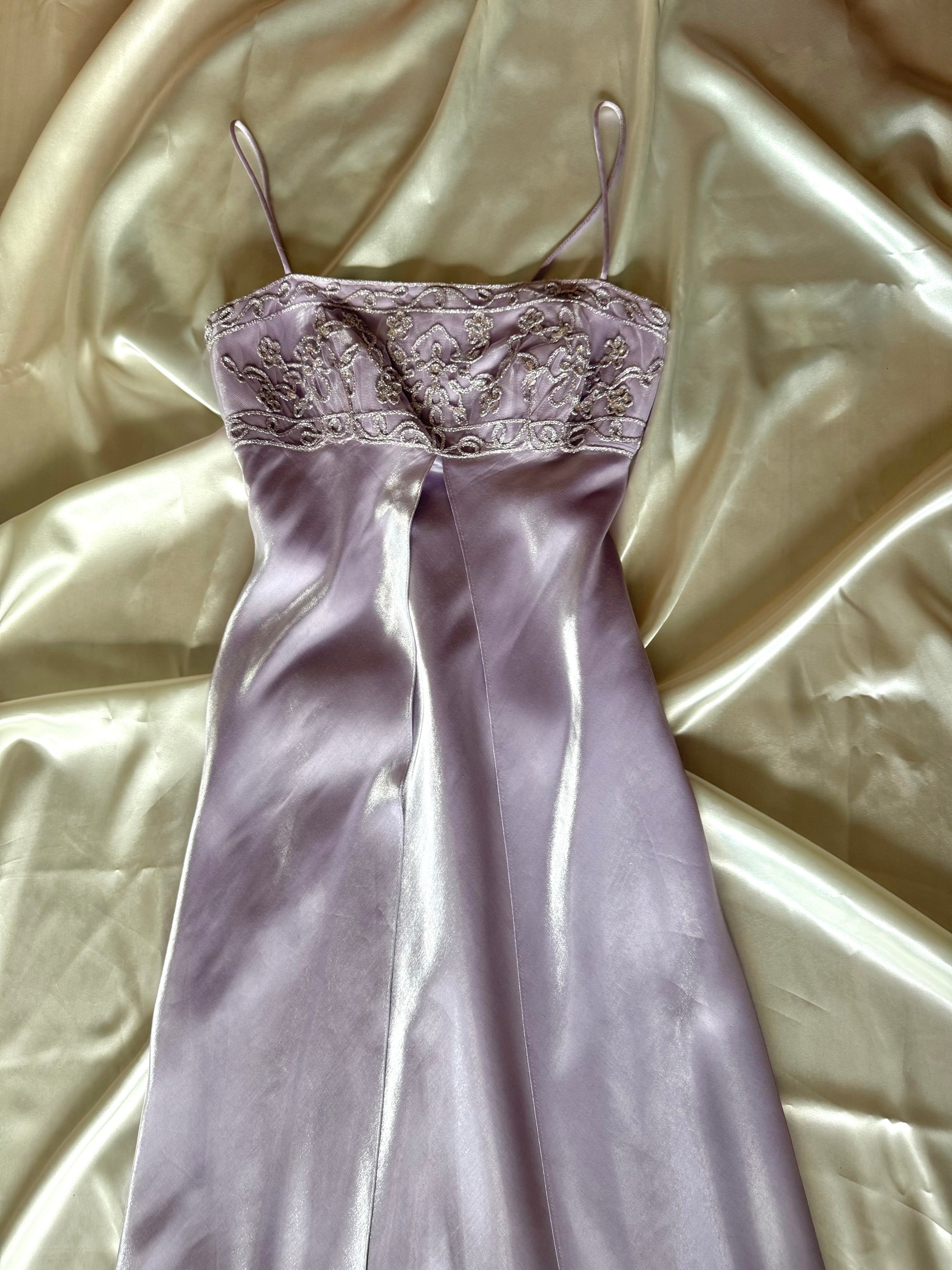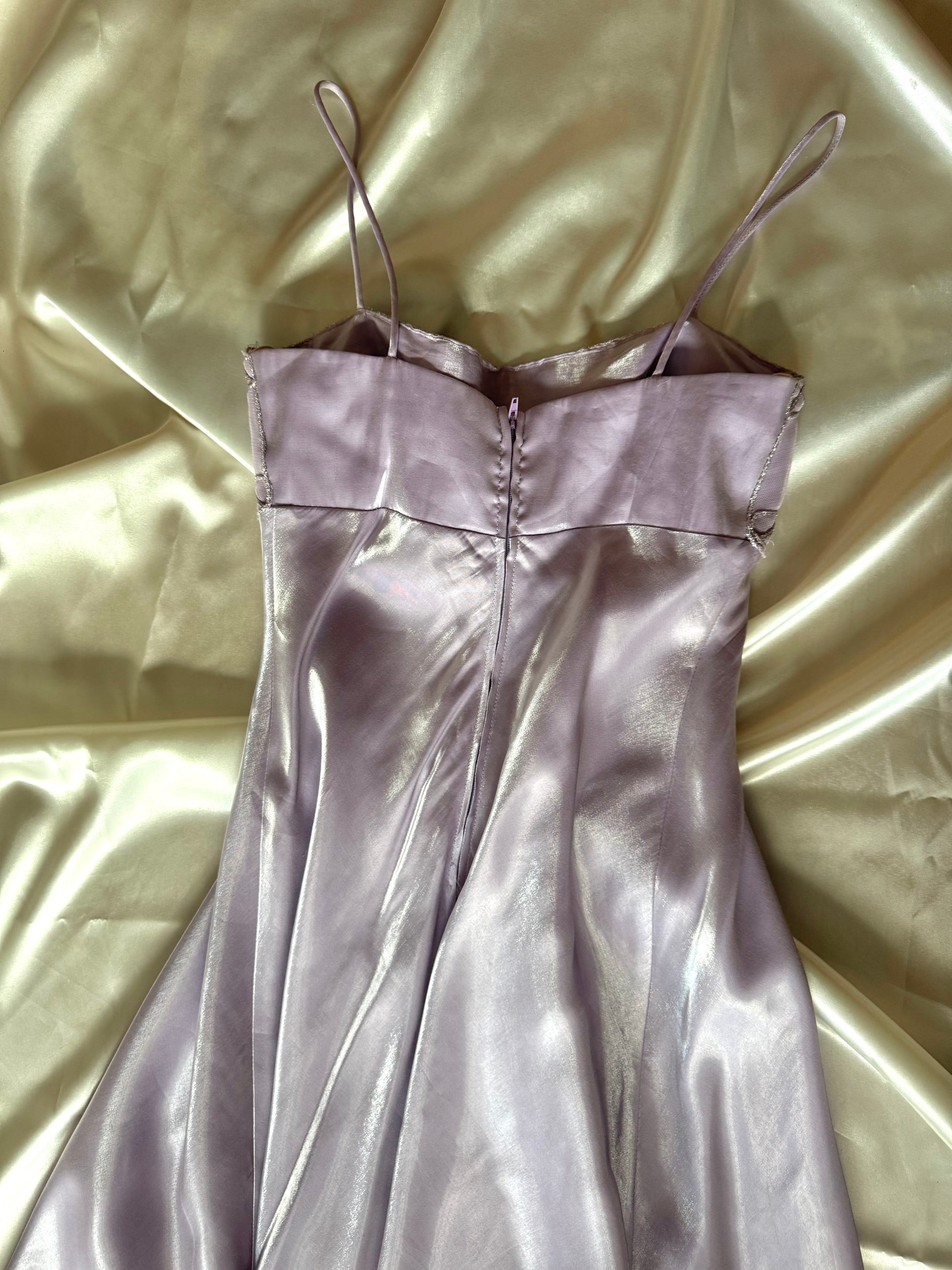 The colour is iridescent and the front has silver thread embroidery. The dress has a mid split elevating the look 💞