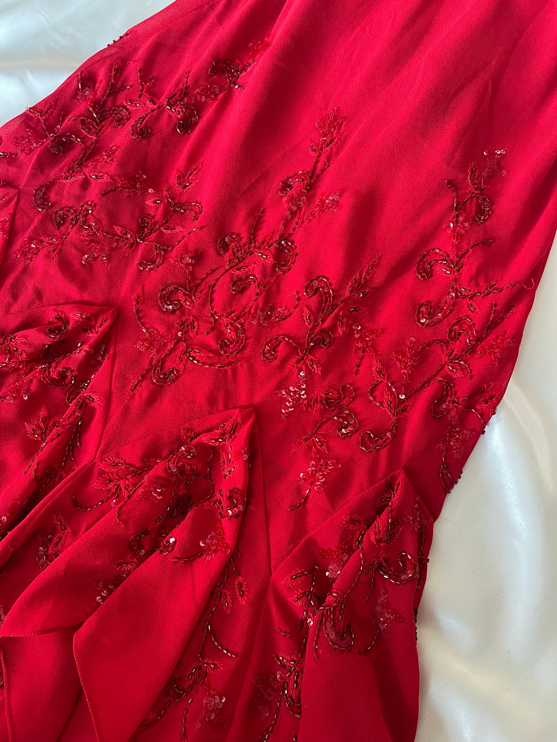 Bust 84cm, waist 66cm, hips free flowing, length 137cm