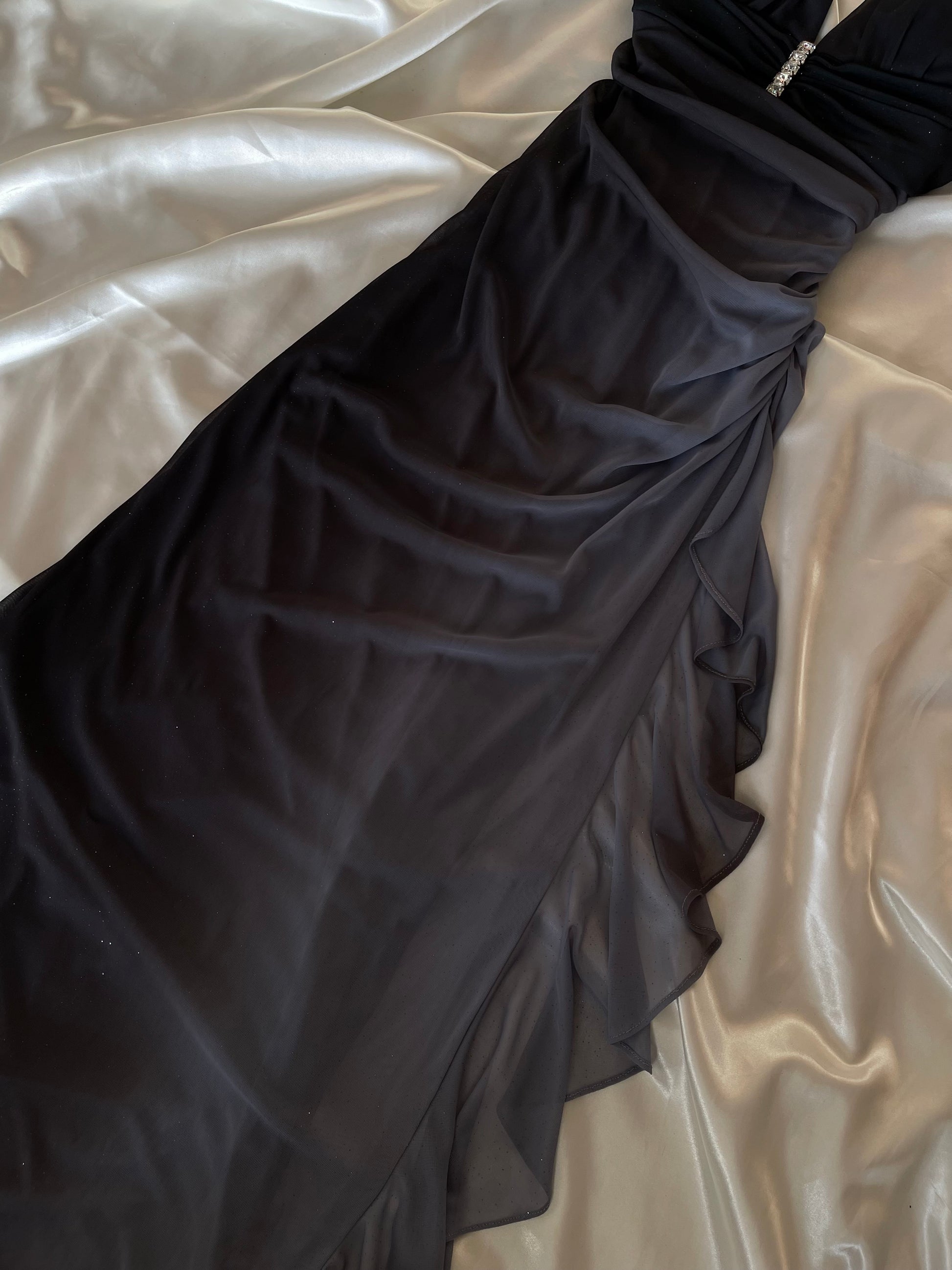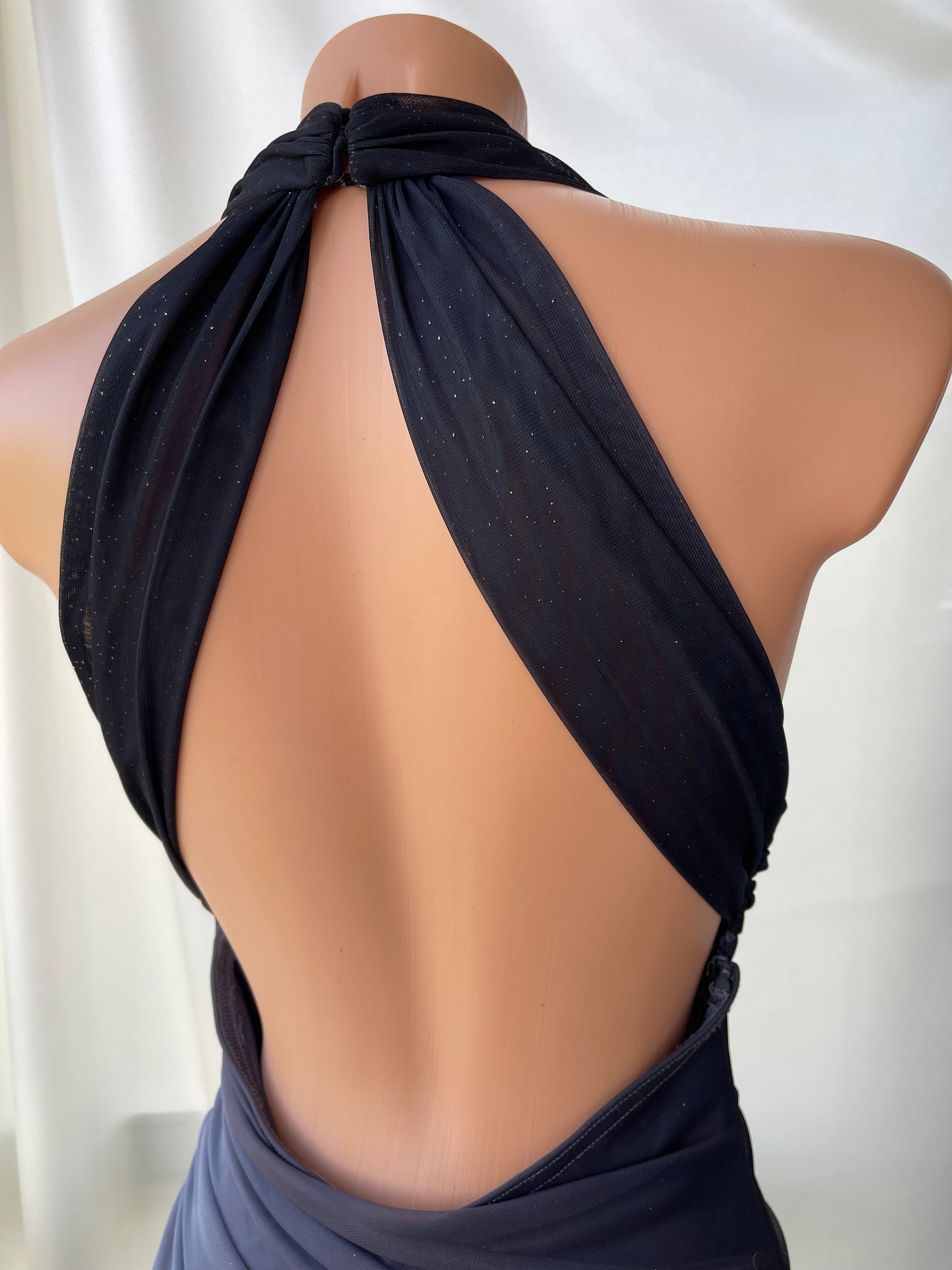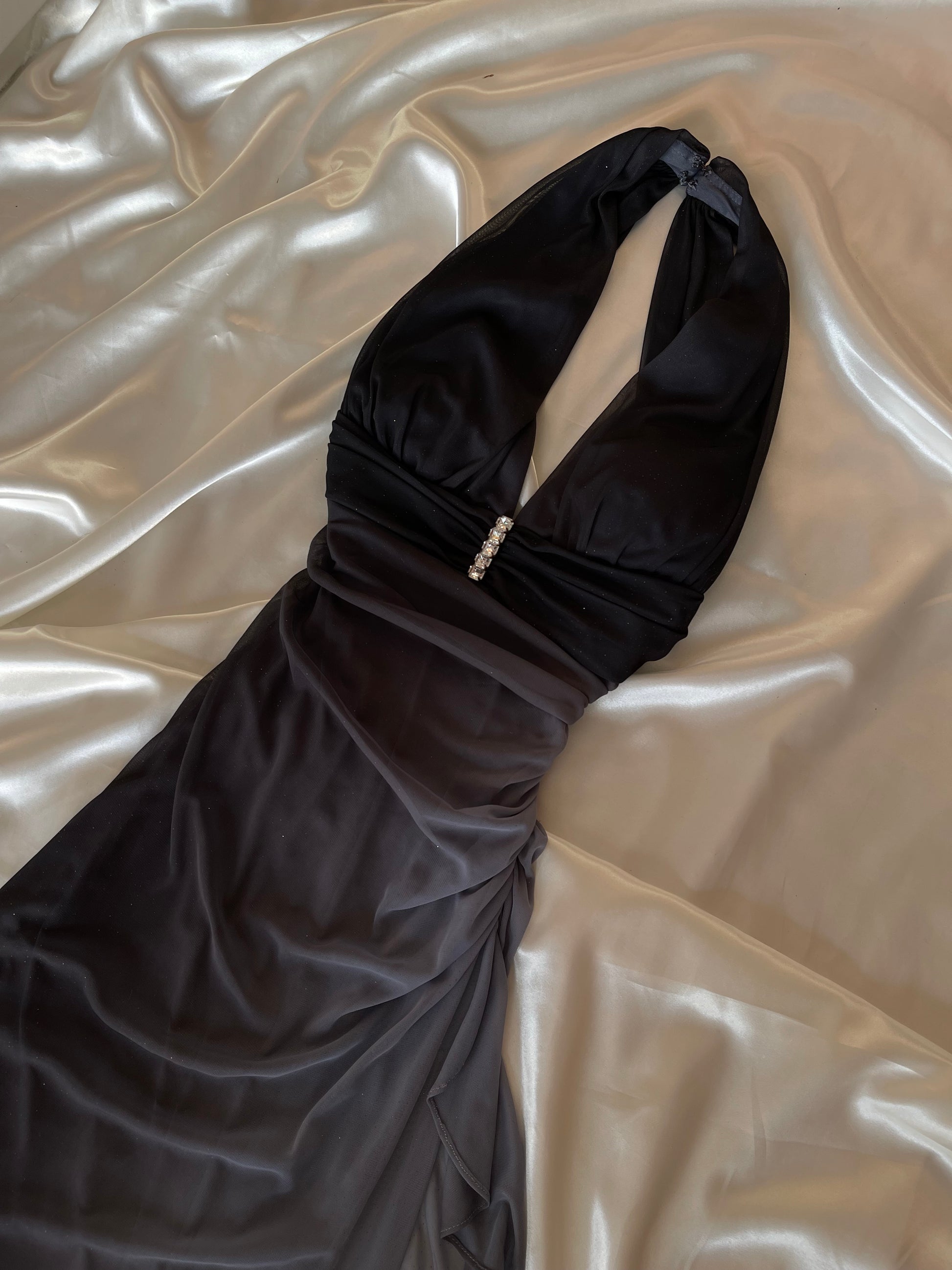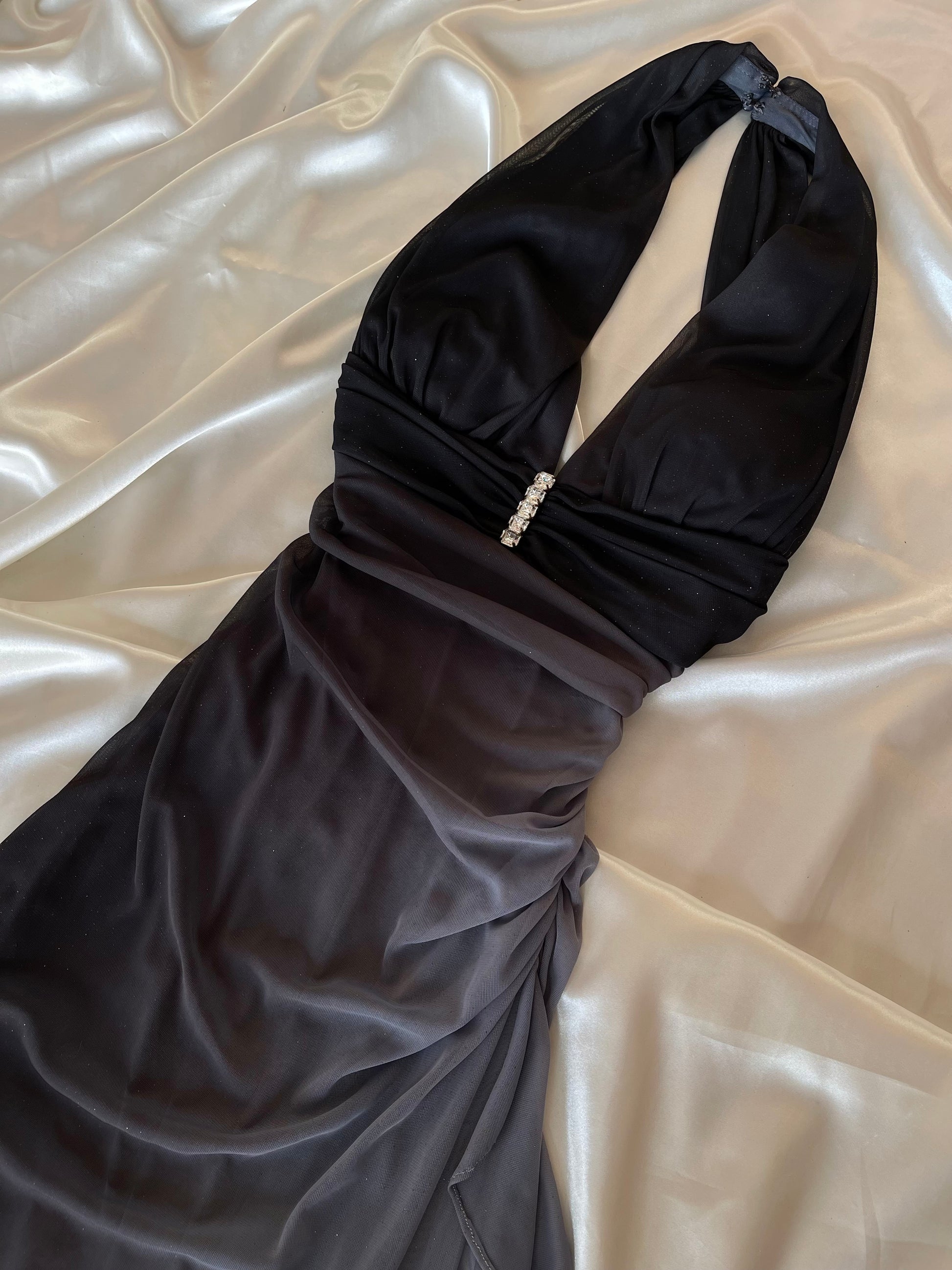 This dress features a halter neck design and a black gray ombre color that will make you stand out at any event