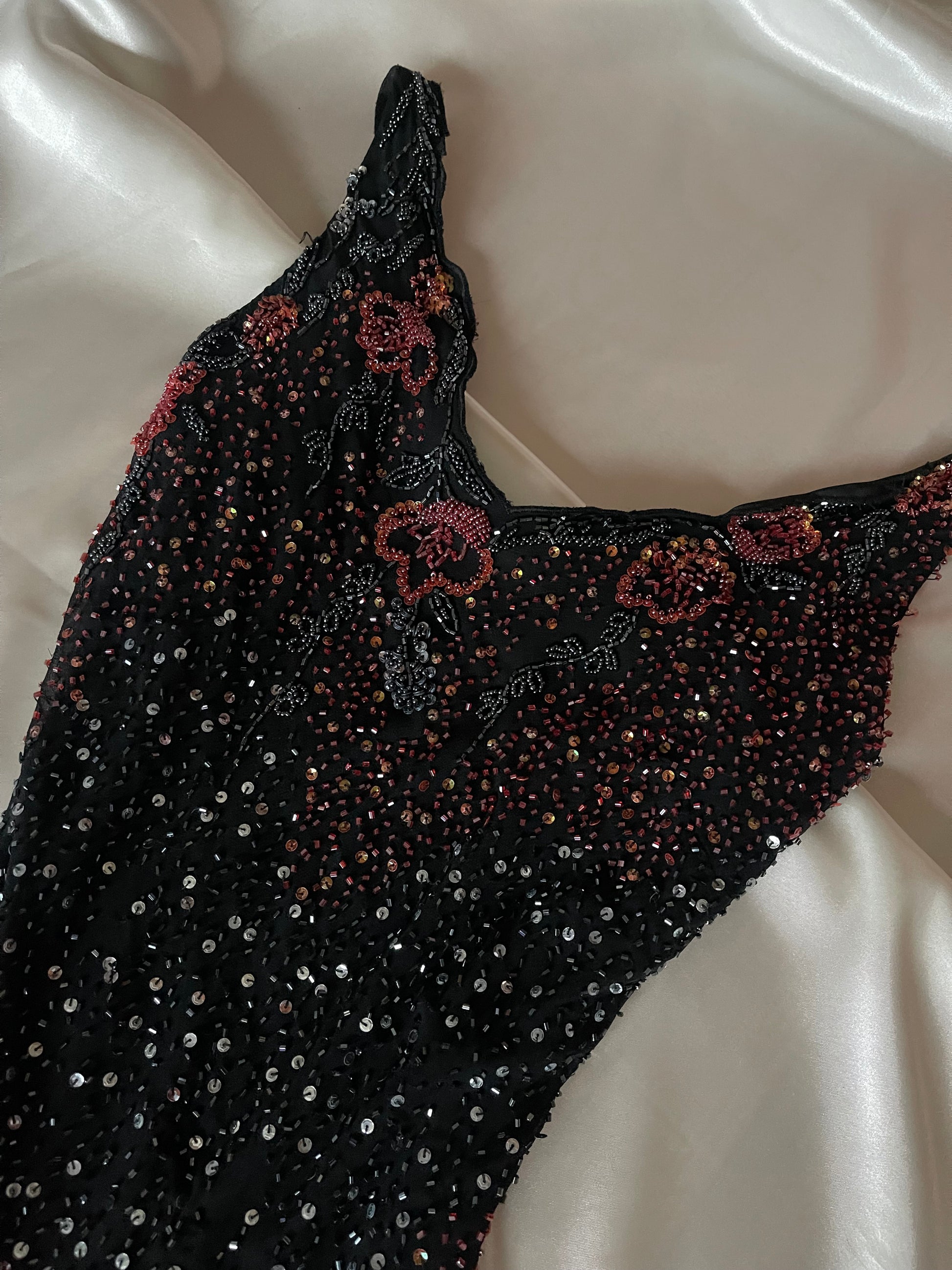 This stunning red and black silk mermaid gown features intricate beading that catches the light for a truly spectacular look.